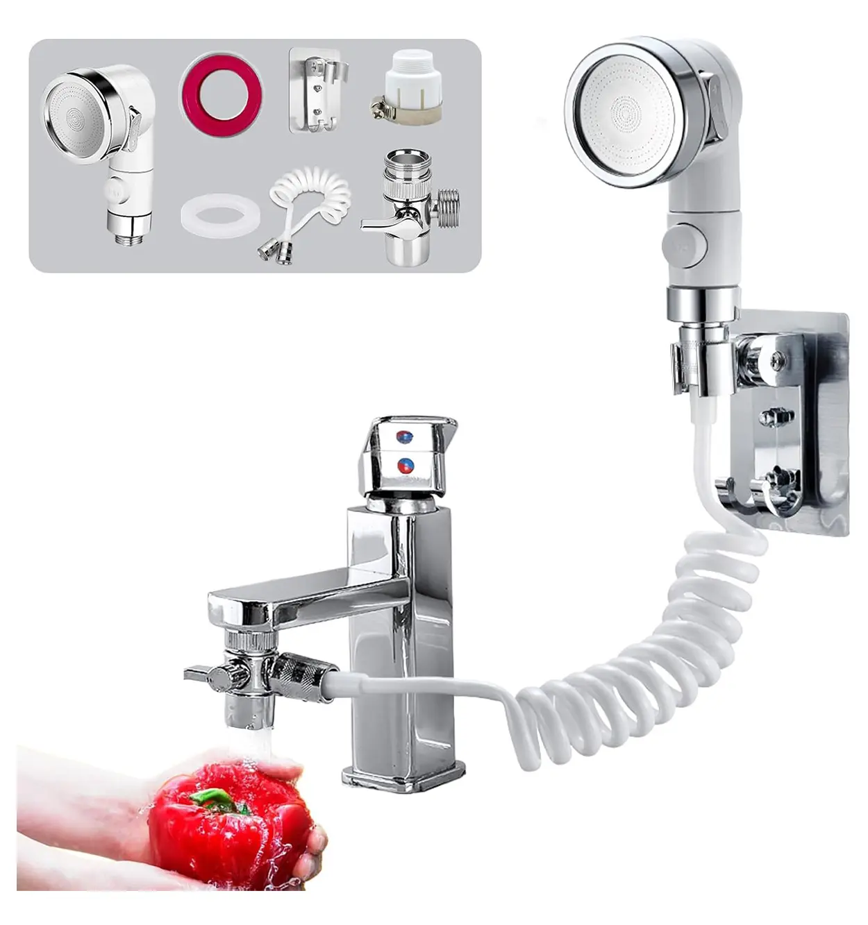 شامل : سر دوش سه وضعیته ABS – شلنگ فنری – اتصال به شیر آب فلزی با وزن ۸۳ گرم (واشر دارد.) – آویز پشت چسبی پلاستیکی
